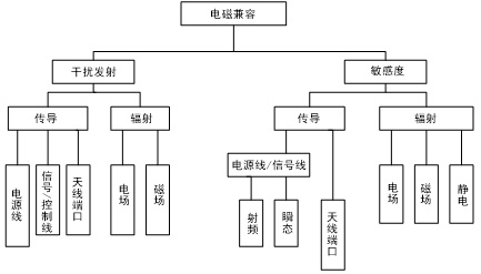 电磁兼容主要有两方面的内容,一个是产品本身对外界产生不良的电磁干扰影响,称为电磁干扰发射EMI;另一个是对外界电磁信号的敏感程度称为电磁敏感度EMS。干扰源、相合途径及敏感设备是电磁兼容的三要素,缺一不可。电磁兼容的详细内容如图1所示。